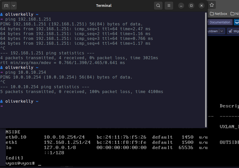 At the moment, our VyOS firewall is unconfigured, can’t connect to the Internet, and our VMs on this vxlan network cannot either.
