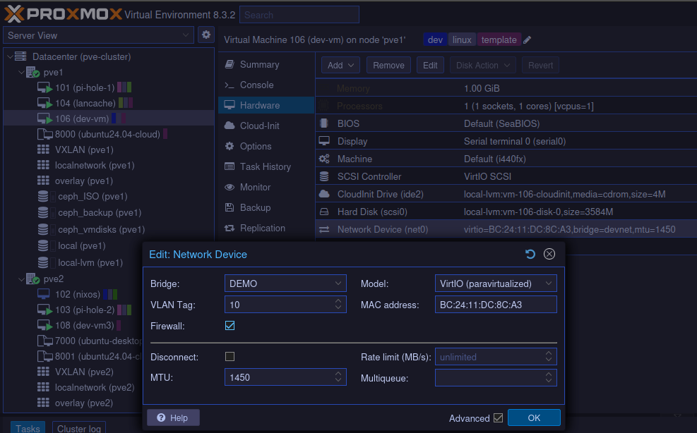 Now lets add the VLAN tag 10 to the Network Device in Proxmox that is attached to Vyos similar to