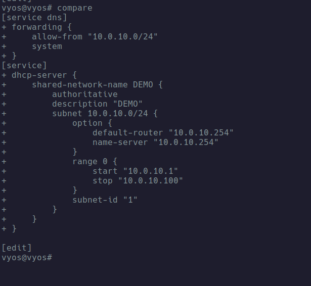 set service dhcp-server shared-network-name DEMO subnet 10.0.10.0/24 range 0 start 10.0.10.1 <- DHCP pool start