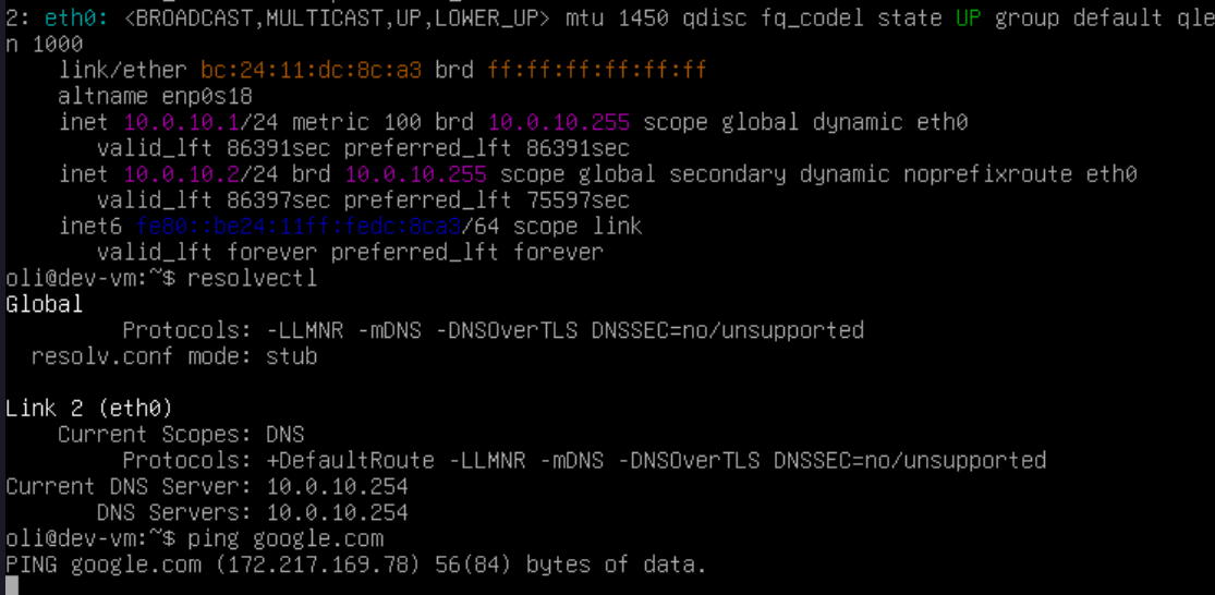 Yes we have an IP address and if we check resolvectl we can see the DNS servers are there. Lets ping