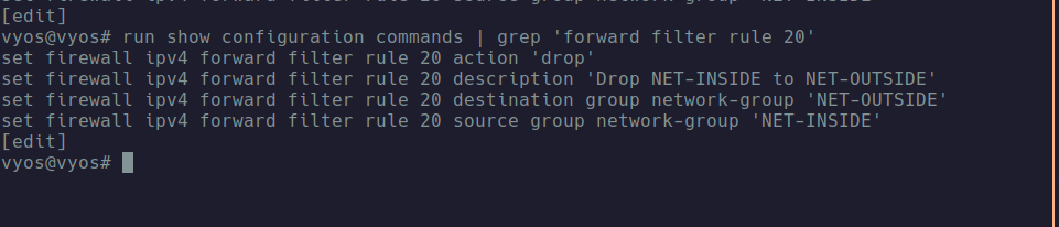 set firewall ipv4 forward filter rule 20 description 'Drop NET-INSIDE to NET-OUTSIDE'
