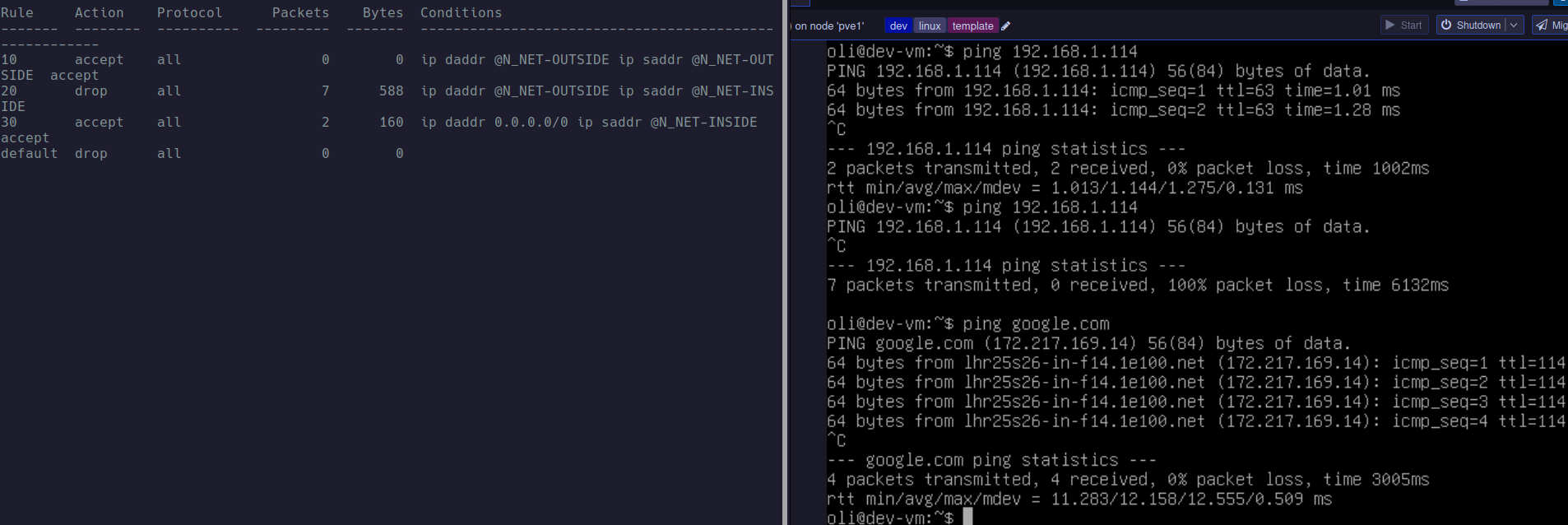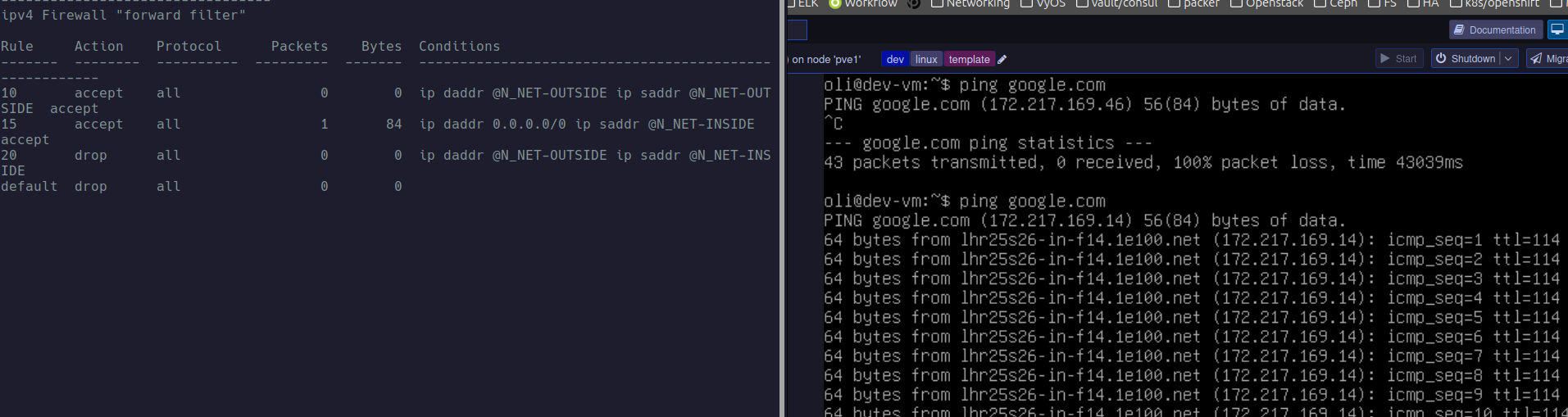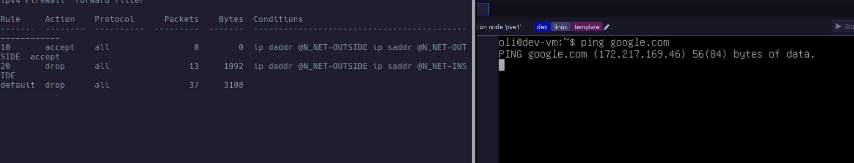 SUCCESS , And if we monitor the forward filter again, we can see dropped packets for rule 20 and accept packets for VM out to the internet.