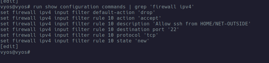 set firewall ipv4 input filter rule 10 description 'Allow ssh from HOME/NET-OUTSIDE'